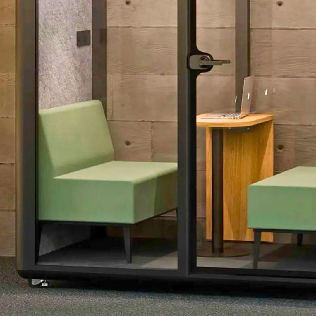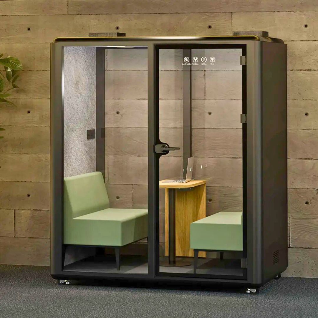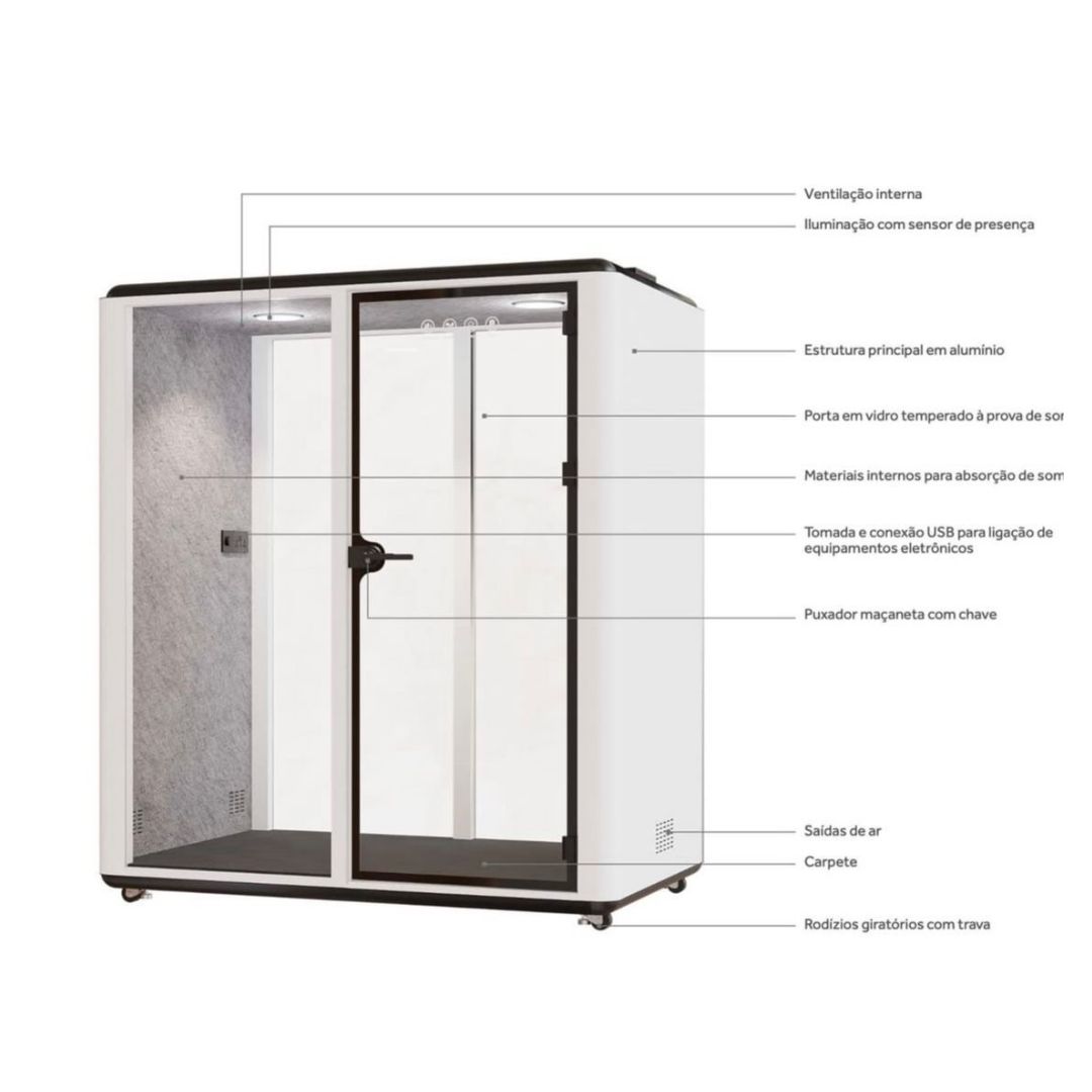 Cabine acústica colaborativa para 2 a 3 pessoas, com isolamento certificado, iluminação LED, ventilação ajustável e conectividade completa. Ideal para reuniões, coworkings e escritórios modernos que valorizam privacidade, produtividade e design sofisticado.