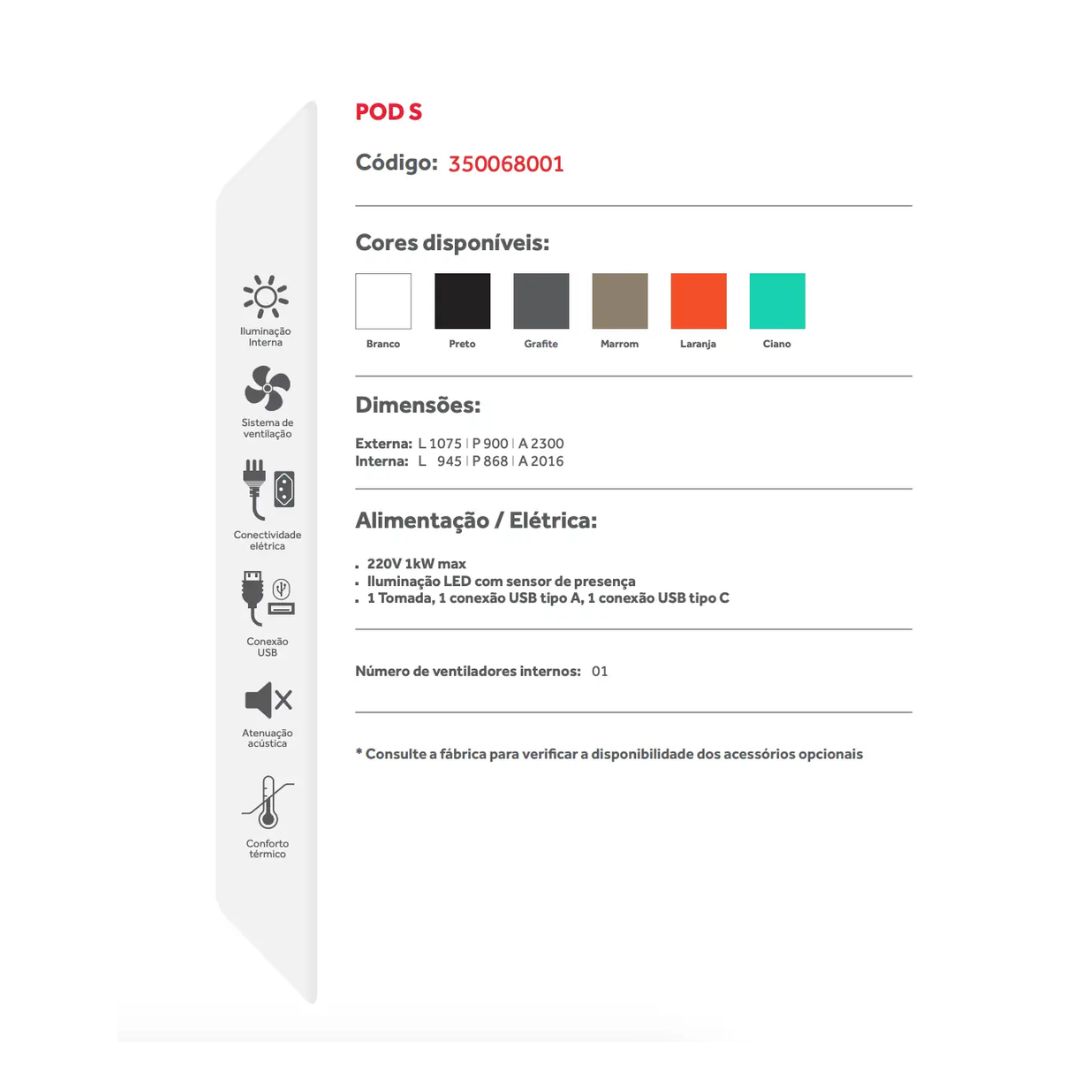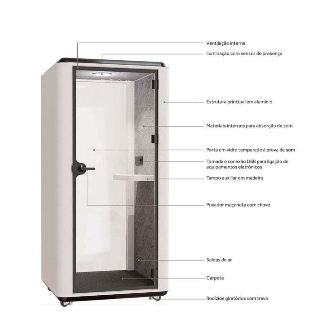Cabine acústica individual com isolamento certificado, iluminação LED, ventilação interna e conexões USB. Ideal para home office ou escritórios que exigem privacidade, produtividade e design sofisticado em espaços compactos.