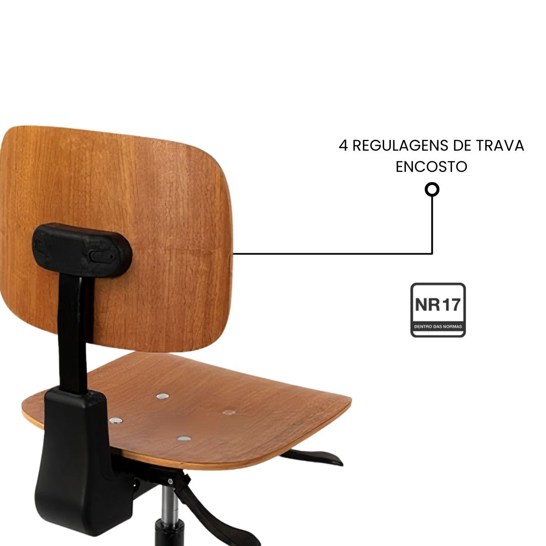Projetada conforme os critérios da NR-17, a Cadeira Caixa Wood oferece ajuste ergonômico completo com sistema Back System, duas alavancas e inclinação de encosto, proporcionando conforto e postura adequada durante longas jornadas. É uma excelente opção para chão de fábrica, laboratórios, áreas técnicas e ambientes administrativos.