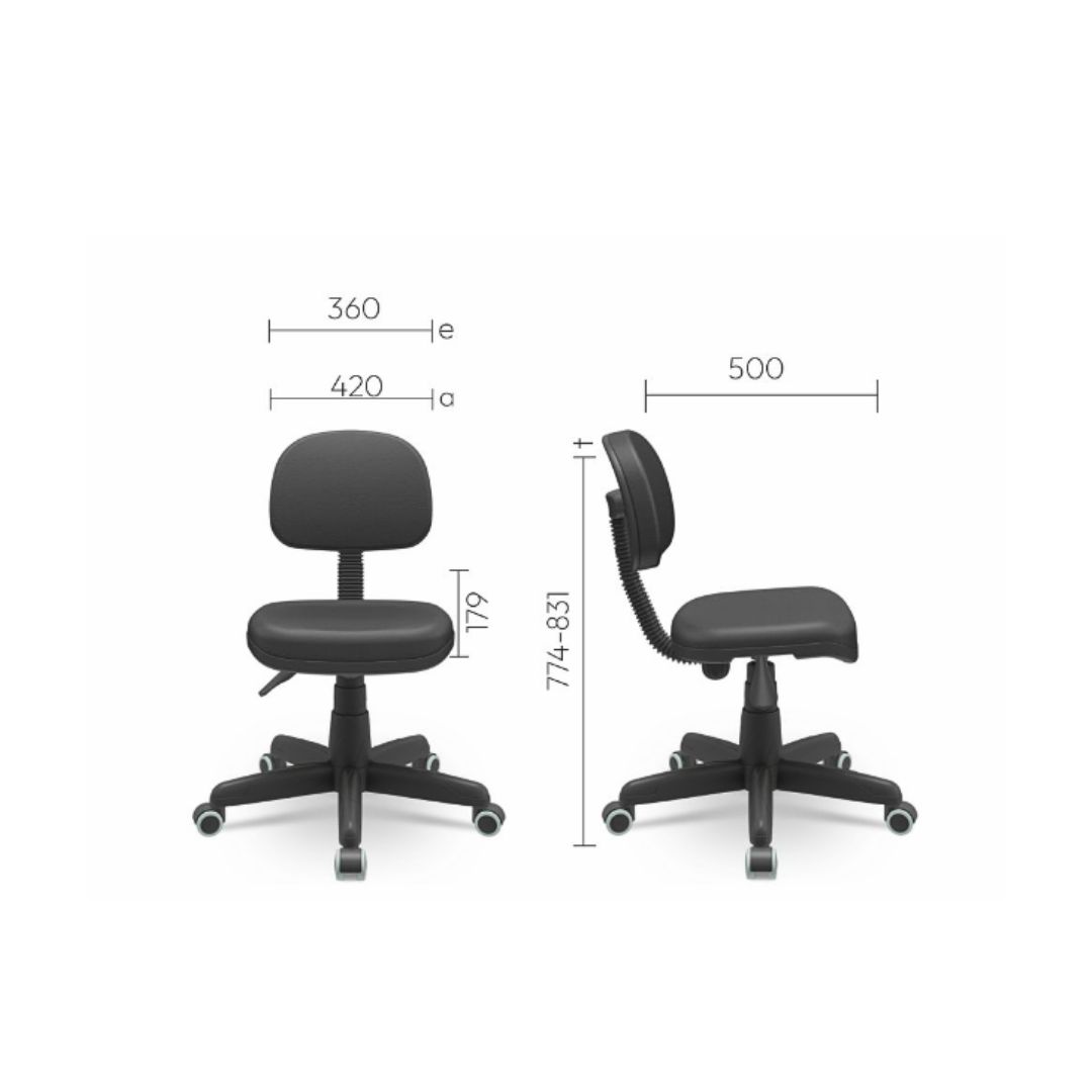 Seu assento e encosto são revestidos em couro ecológico preto T19, com espuma injetada de alta qualidade, garantindo maciez e resistência ao uso contínuo. Com base giratória de diretor e estrutura robusta, ela suporta até 110 kg, atendendo às exigências de uso prolongado em jornadas de trabalho intensas.