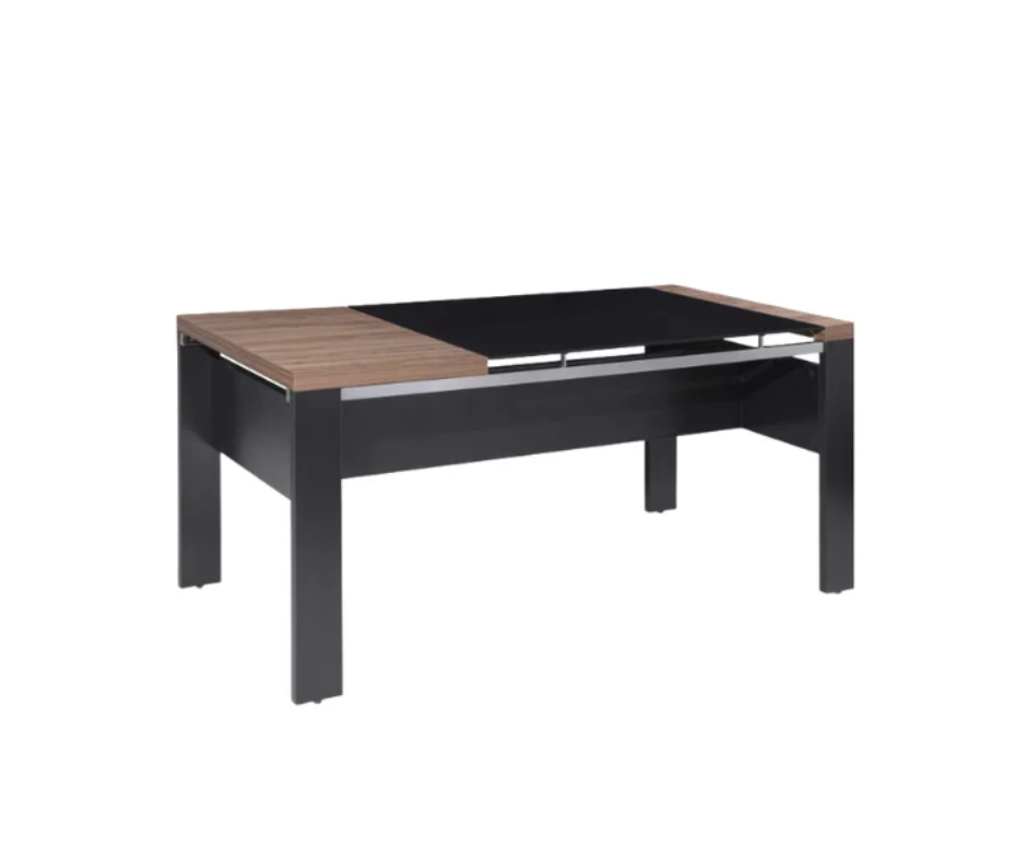 - Estrutura em MDP 25 mm, tampo madeirado e vidro incolor ou serigrafado preto com suporte em tubo de aço cromado (20 x 30 mm).