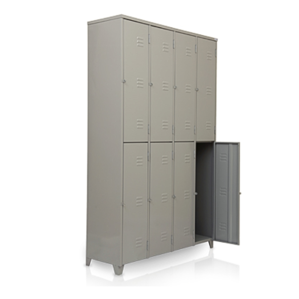 Com 8 vãos sobrepostos, esse roupeiro oferece um espaço intermediário para organizar pertences pessoais, uniformes ou objetos, tornando-o ideal para locais com necessidades de armazenamento moderadas. Cada porta é reforçada internamente com um suporte vertical, proporcionando maior resistência e longevidade ao móvel, o que é essencial para suportar o uso frequente.